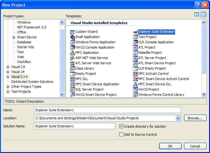 The most professional way to implement extensions would have been through ActiveX. but instead I chose another, less powerful way. In fact, using COM objects is highly professional, but has two big drawbacks: it would take much of my time, and not everybody is capable (or willing) of writing COM objects. I decided to keep it simple, but nothing stands in the way of changing things in the future if necessary. To easily start writing extensions for the CFF Explorer, you should install the ExSuiteExtWiz msi file in the SDK directory. It's a wizard built for Visual Studio 2005. After the setup is complete, you can open your Visual Studio, click on New Project and then on Explorer Suite Extension in the Visual C++ section. As I said, I kept it simple, so we're going to work with pure Win32. The Visual Studio project dialog should be something like this:
