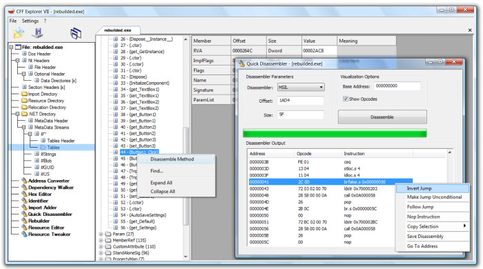What I'm going to present here is a little example of how to hook the JIT and retrieve information from it. What I'm going to do is to show the class and method name of each jitted method and of each method this method is calling. This is a good time to introduce the fact that the compileMethod functions not only jits the method it's supposed to, but also all the methods called by that method and all the methods called by those methods etc. This is obviously so, as a call can't be jitted if the called method hasn't already been jitted along with its submethods etc. However, even if this is pretty obvious, it is worth to keep that in mind. To disassemble the method's MSIL, I use my DisasMSIL engine.