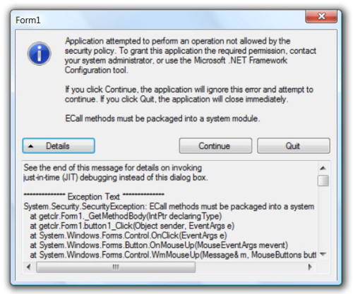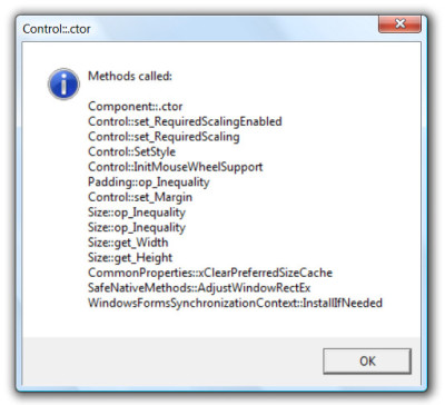 The findMethod has some limitations which I will talk about later. The output of this little example is a series of message boxes informing the user about the method currently being jitted and its calls.