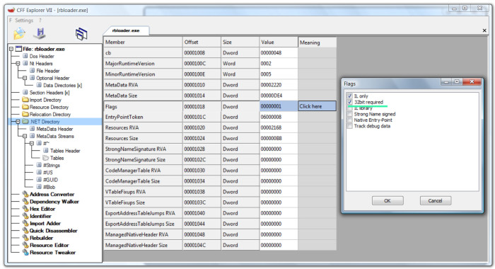 Also, the first executed assembly decides the .NET framework platform. Thus, the loader should be compiled consequently. What this means is that you can choose the platform on which a certain assembly has to run from the Visual Studio options. If you choose an 64-bit platform, then the PE of the assembly will be a 64-bit PE which can run only on the platform it was meant for. Whereas 32-bit PEs can run on every platform. To force a 32-bit PE to use the x86 framework, a flag has to be set in the .NET Directory's Flags field: