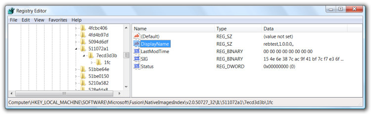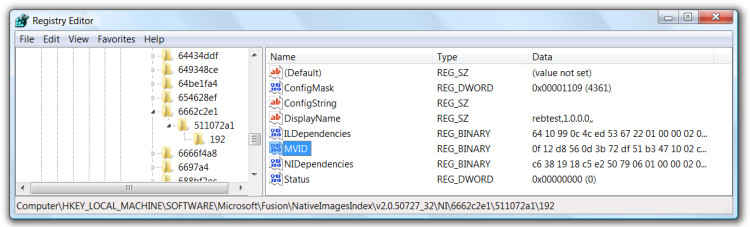 The MVID value specifies the path of the native image. In this case it'll be: "C:\Windows\assembly\NativeImages_v2.0.50727_32\rebtest\0f12d8560d3b72df51b3471002c911a0". Also, it should be noted that the "511072a1" subkey references the appropriate "IL" subkey.