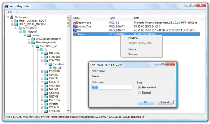 Numbers are stored in hex format, whereas all other data is base64 encoded. The virtual registry file can be edited with VirtualReg Editor (vregedit), which is very user-friendly as its interface is identical to regedit's one.