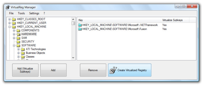 The main form (VirtualReg Manager) of this tool provides the visual interface to create a virtual registry. This can also be achieved through command line, as we'll see later. One can decide whether to virtualize a key along with its subkeys or not.