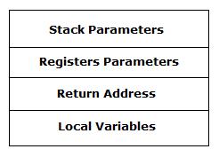 And now, the most important things. Calling convention and stack. x64 assembly uses FASTCALLs as calling convention, meaning it uses registers to pass the first 4 parameters (and then the stack). Thus, the stack frame is made of: the stack parameters, the registers parameters, the return address (which I remind you is a qword) and the local variables. The first parameter is the rcx register, the second one rdx, the third r8 and the fourth r9. Saying that the parameters registers are part of the stack frame, makes it also clear that any function that calls another child function has to initialize the stack providing space for these four registers, even if the parameters passed to the child function are less than four. The initialization of the stack pointer is done only in the prologue of a function, it has to be large enough to hold all the arguments passed to child functions and it's always a duty of the caller to clean the stack. Now, the most important thing to understand how the space is provided in the stack frame is that the stack has to be 16-byte aligned. In fact, the return address has to be aligned to 16 bytes. So, the stack space will always be something like 16n + 8, where n depends on the number of parameters. Here's a small figure of a stack frame: