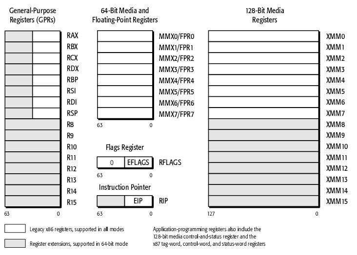 Of course, all general-purpose registers are 64 bits wide. The old ones we already knew are easy to recognize in their 64-bit form: rax, rbx, rcx, rdx, rsi, rdi, rbp, rsp (and rip if we want to count the instruction pointer). These old registers can still be accessed in their smaller bit ranges, for instance: rax, eax, ax, ah, al. The new registers go from r8 to r15, and can be accessed in their various bit ranges like this: r8 (qword), r8d (dword), r8w (word), r8b (low byte).