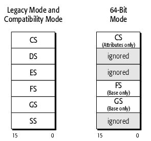 Applications can still use segments registers as base for addressing, but the 64-bit mode only recognizes three of the old ones (and only two can be used for base address calculations). Here's another figure: