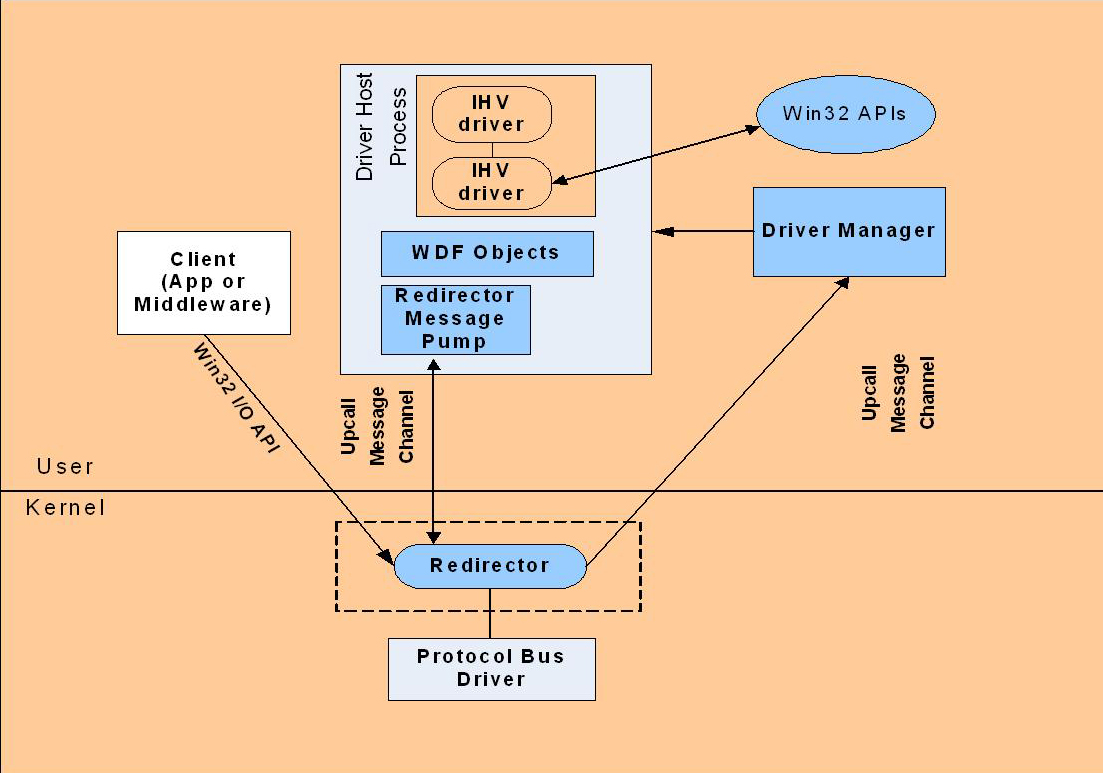 In pratica il WDF è composto da due framework, uno user mode e uno kernel mode. La sessione winhec 2004 di introduzione ha illustrato brevemente le caratteristiche dei due framework. Entrambi supportano PnP, Power Management, I/O asincrono basato sui pacchetti e filtri. Anche il processo di installazione dei driver resta uguale a quello dei WDM e si applica sia ai kernel mode driver sia a quelli user mode, non fa differenza. Per i driver kernel mode però non vi sarà il riavvio in caso di crash, cosa che invece è prevista per quelli user mode. Infine il linguaggio inizialmente previsto per codare in kernel mode sarà il C (poi anche il C++) e in user mode C++ e C# (e il managed code consente la software isolation che garantirà una grande capacità di evitare crash e di recupero).