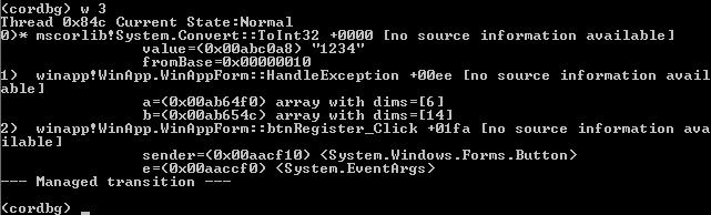 Di nuovo g e vedrete appena pigiate register (inserendo ovviamente username e serial della lunghezza giusta) il debugger poppare. Sì, ma adesso noi non sappiamo da dove è stato chiamato quel ToInt32.. Per rimediare a ciò è necessario digitare il comando w (where) seguito dal numero di calling sequence che vogliamo vedere (3 direi è sufficiente per individuare il punto esatto). Dovreste vedere una cosa di questo genere: