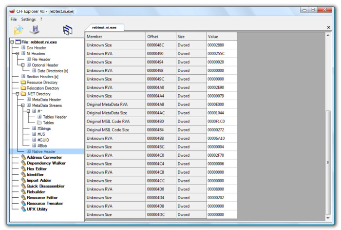 Of course, this procedure is only possible when the native image contains the original MSIL code of the assembly. Native images, and I'm talking about the ones produced by the framework 2.0 and higher (I've never explored 1.0/1.1 native images), contain a double set of MetaData sections. If you open the Native Header of a native image with the CFF Explorer: