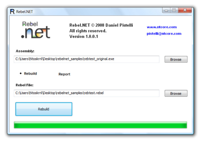 The interface of Rebel.NET is quite a simple one. As input it requires a .NET assembly to be rebuilded and a Rebel.NET rebuilding file. The Rebel.NET file contains the data that has to be replaced in the original assembly.
