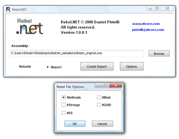 Rebel.NET can also create a Rebel.NET file from a given assembly. This is a key functionality, since some times the data of the original assembly has to be processed first to produce a Rebel.NET file for the rebuilding of the assembly. This sort of "report" feature can also be used to analyze the methods of an assembly, since reading the original data from a .NET assembly isn't as easy as reading a Rebel.NET file. It's possible to choose what should be contained in the Rebel.NET file.